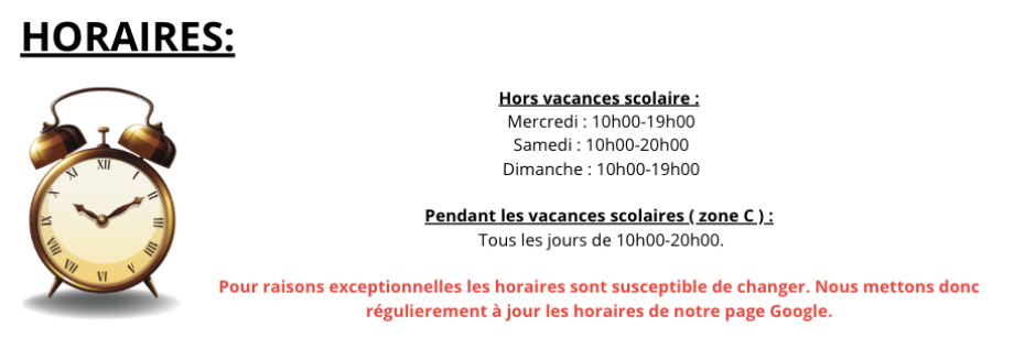 ATTENTION! Pour les vacances scolaire d'Aout 2025 les horaires sont différents: