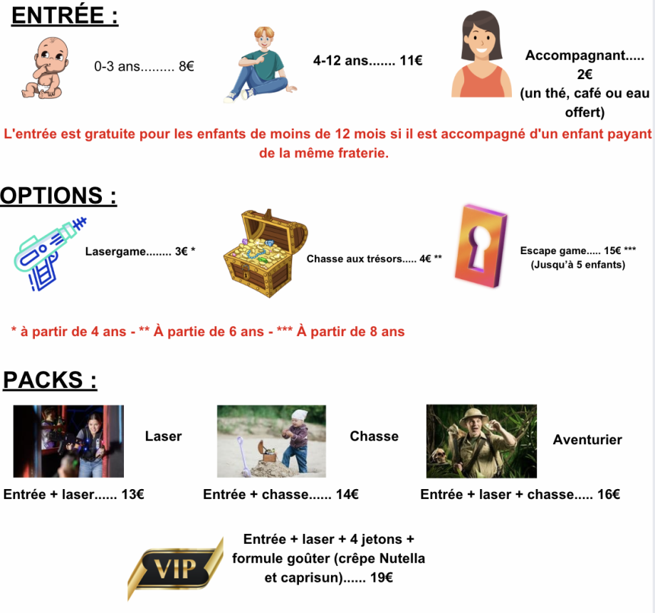 - Journée (10H-16H): 8€ par enfant